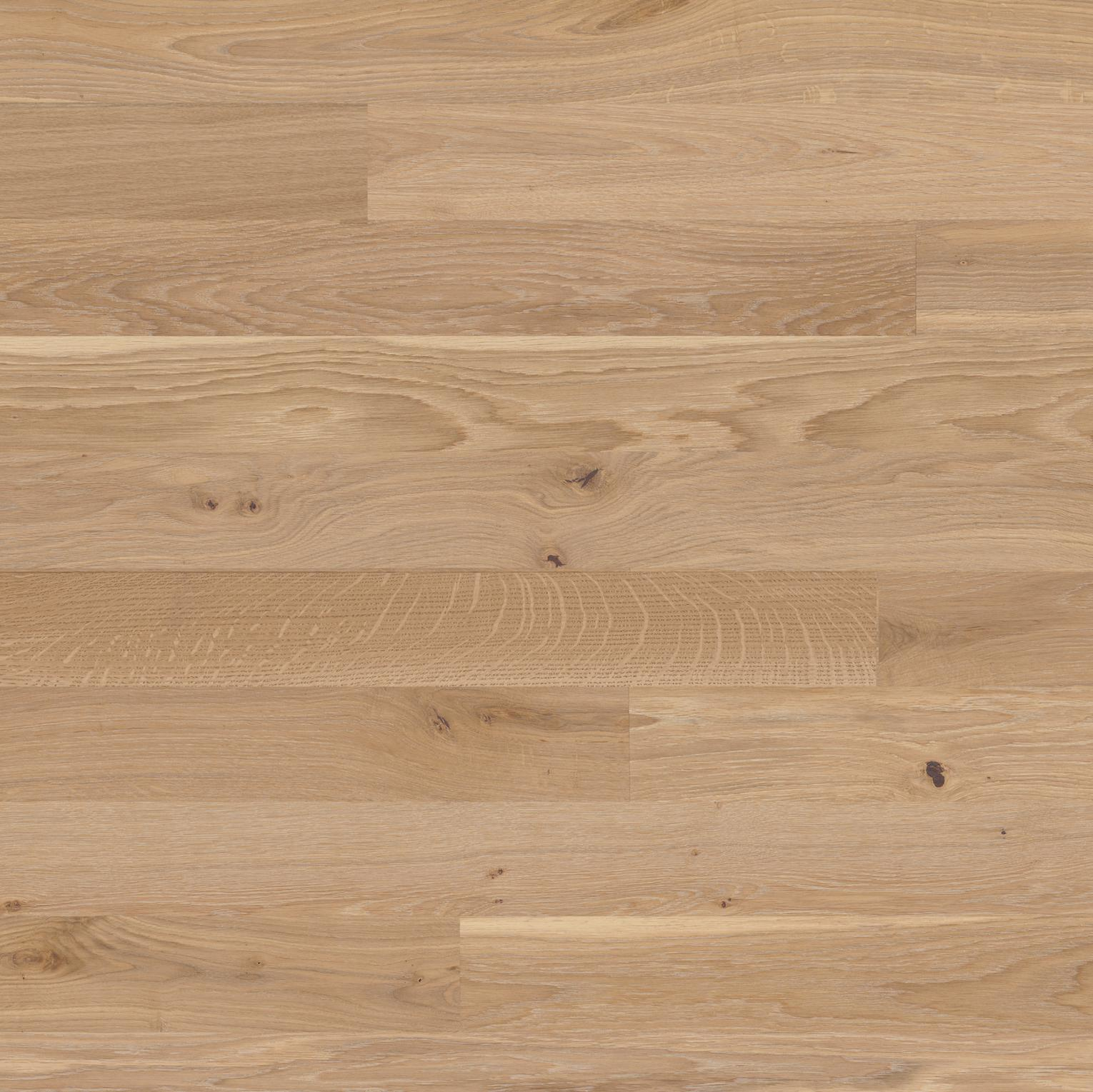 Die Dielen schaffen ein harmonisches, flächiges Gesamtbild und sind in gebürsteter Ausführung eine Wohltat beim Barfussgehen.