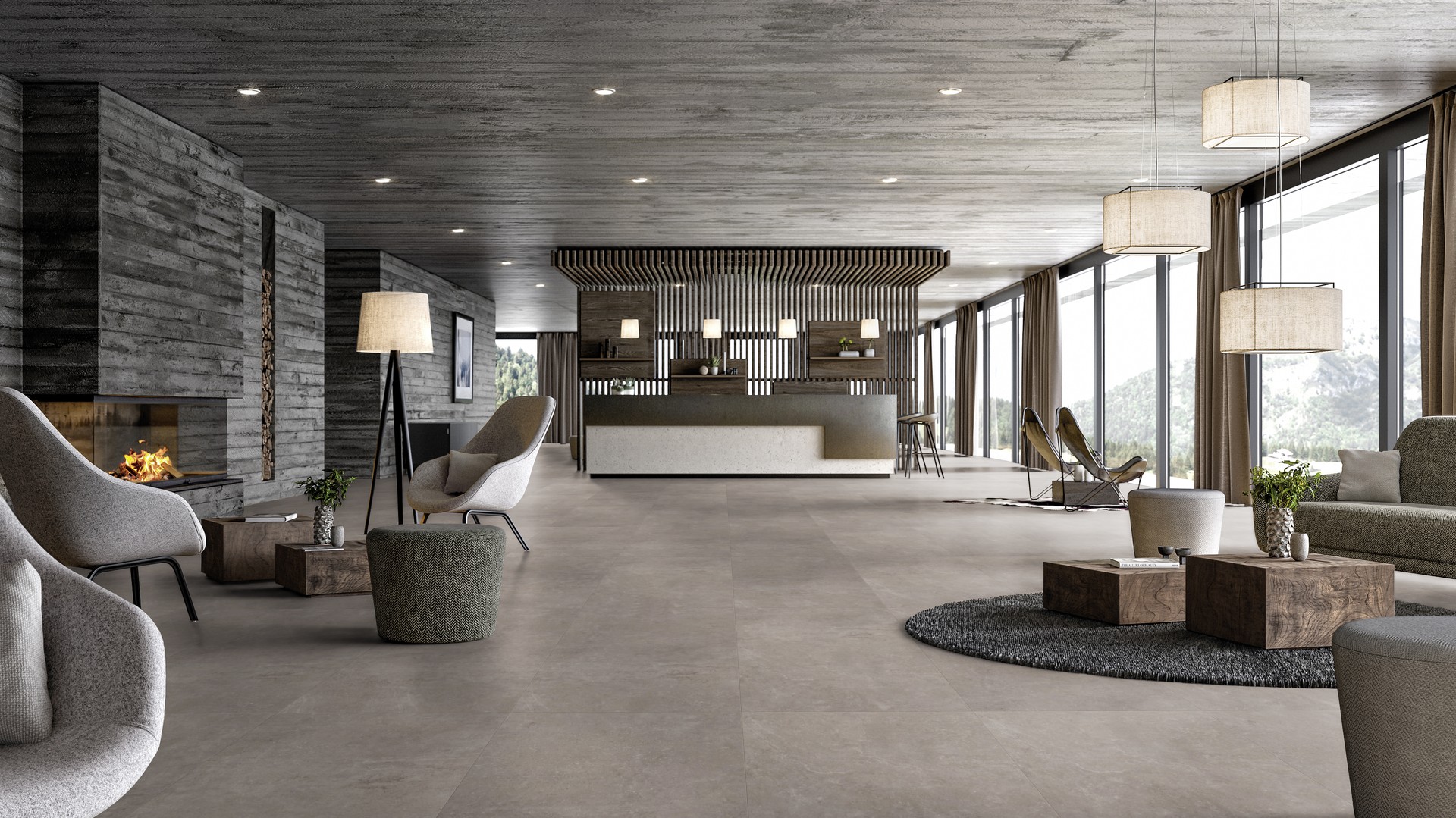 Großformatige Zementfliesen mit charakteristisch sanften Auswaschungen unterstützen die Prägung puristischer Räume.