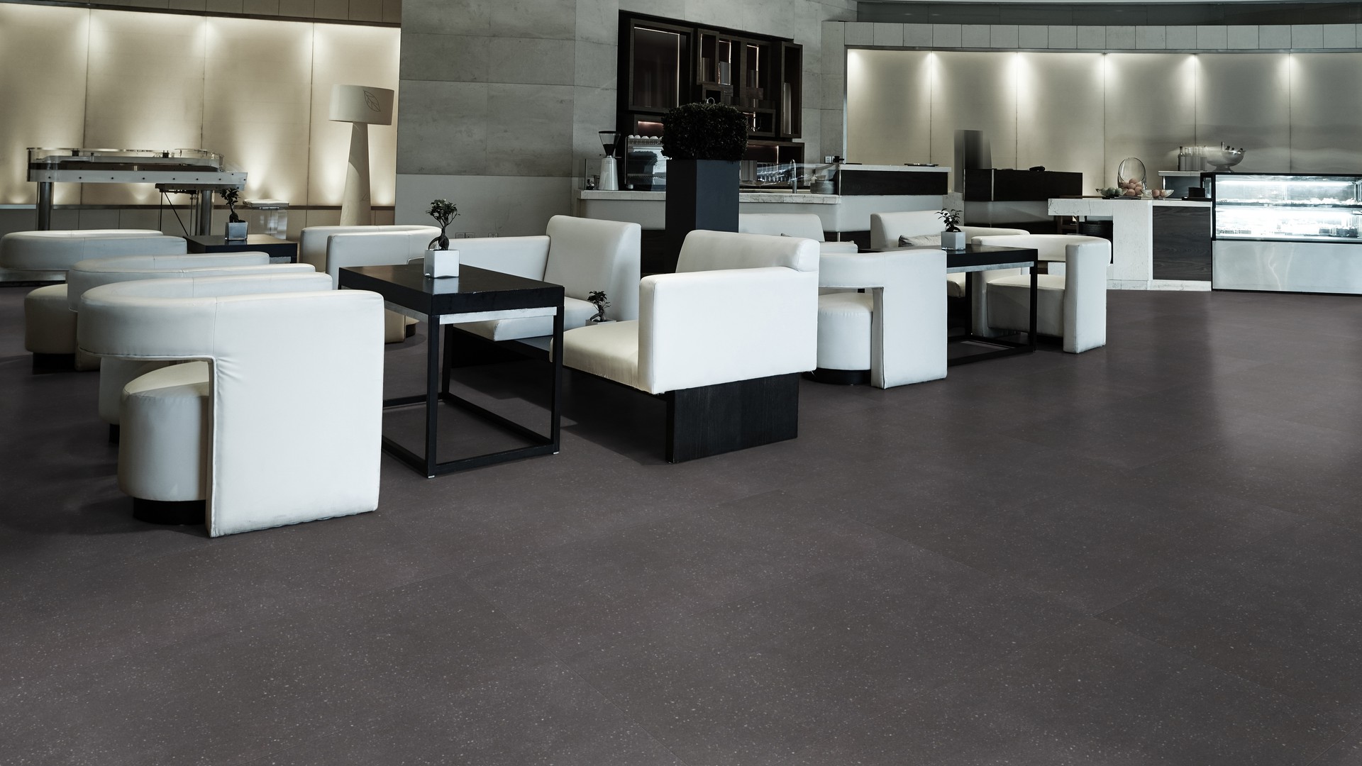 Dunkle Terrazzo-Fliesen mit feinkörnigen Einschlüssen zeigen sich in ihrer elementaren Optik besonders elegant.