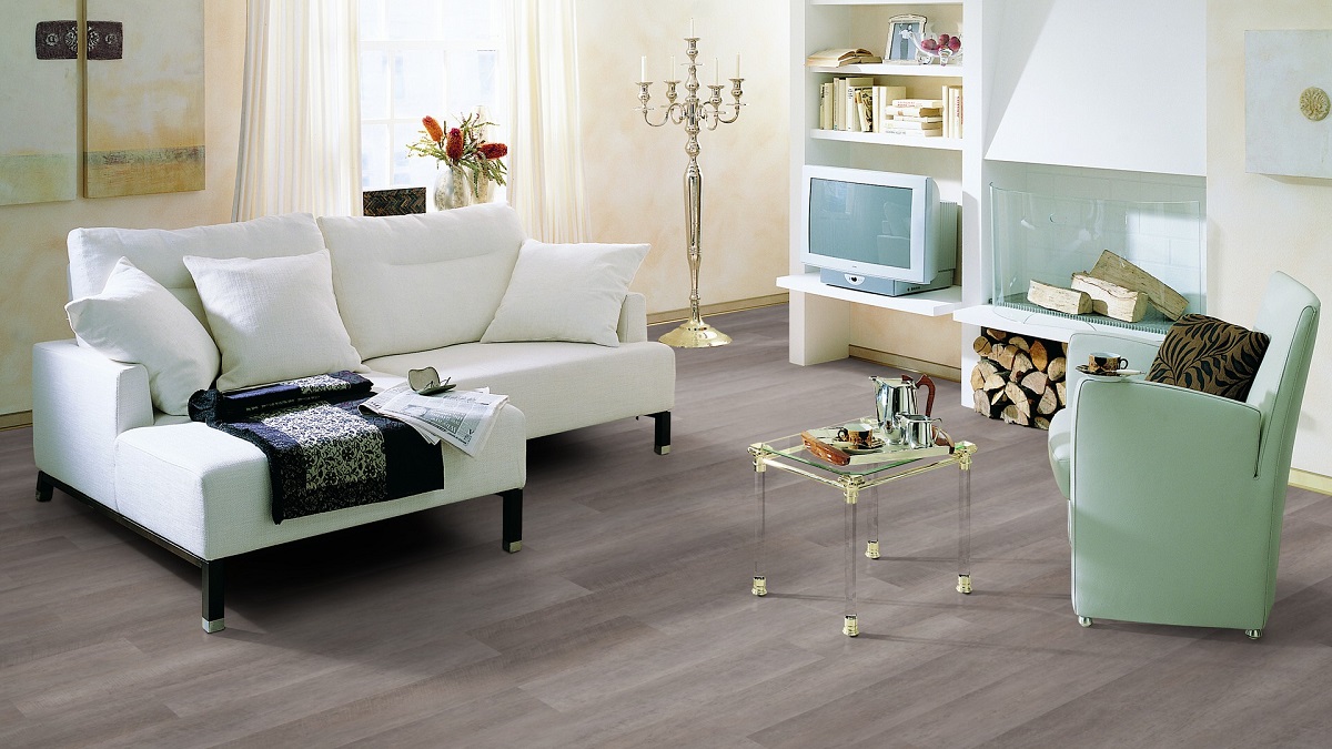 Gehaltvolle Eiche mit edler, grauer Farbgebung und rustikaler Prägung, tritt am Boden dezent in den Hintergrund.